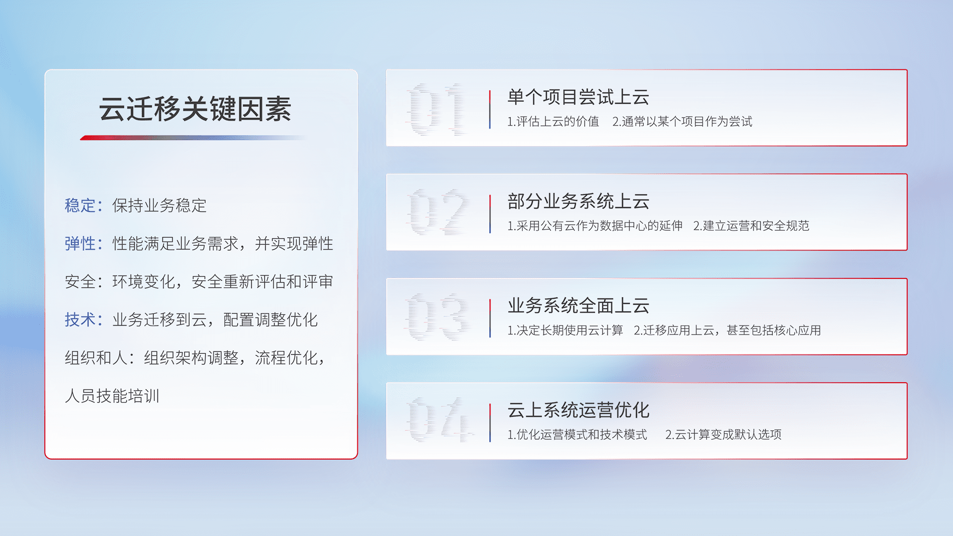结合实际业务,,从规划设计、、、、云平台选型、、云原生改造、、、、数据迁移、、、、集成交付,,,迁移全过程为客户识别最佳上云路径,,,做好风险识别管理,,,设计网络架构、、身份权限、、、、安全审计合规、、、操作审计、、、日志审计、、、监控告警策略、、多站点容灾设计等,,,对云上基础设施进行整体规划,,,提升IT治理水平,,以满足弹性、、高可用、、、、高性能的需求。。