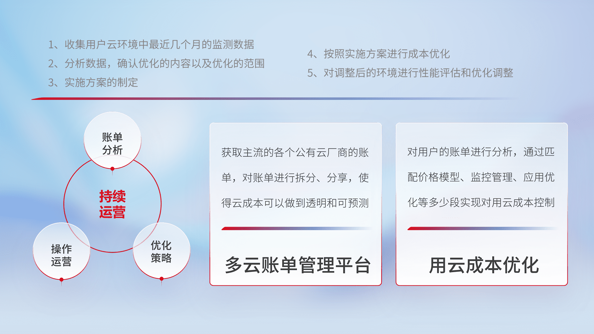 通过多云纳管,,,,以统一的资源数据模型把客户的云资源进行抽象和封装,,,进而实现对多云资源的统一操作,,,保障云资源管理的可靠性、、、稳定性与可用性。。。。量身定制化运维内容,,,配置、、开发运维、、、、补丁管理、、、备份、、、、监控、、、、认证和访问管理、、、、审计和日常巡检等,,保障在用云过程中的可靠度,,稳定度以及高可用率。。。。