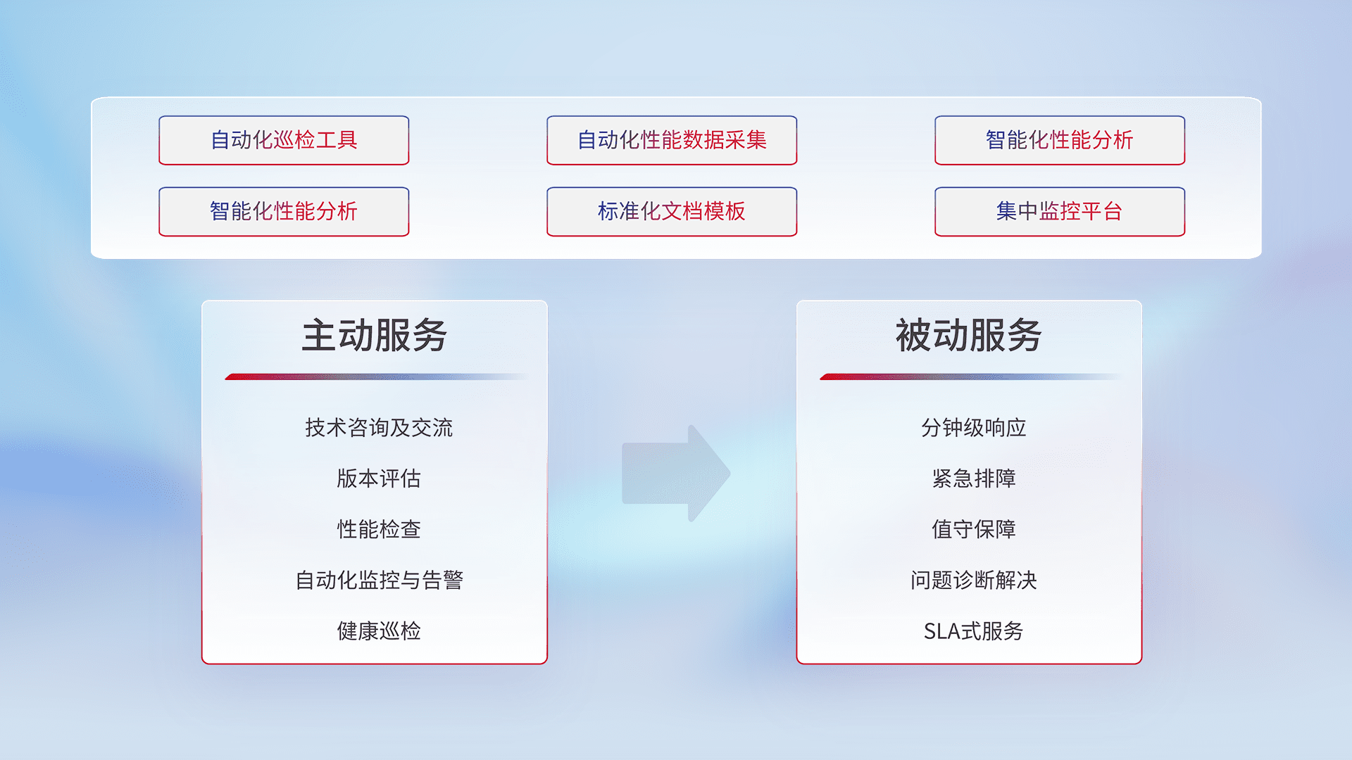 智能化工具和标准化文档,,,,保障服务质量,,,提供主动服务(包含技术咨询、、、、版本评估、、性能检查、、、自动化监控与告警、、、健康巡检)和被动服务包含(分钟级响应、、、、紧急排障、、、值守保障、、、问题诊断解决、、、SLA服务)。。。。