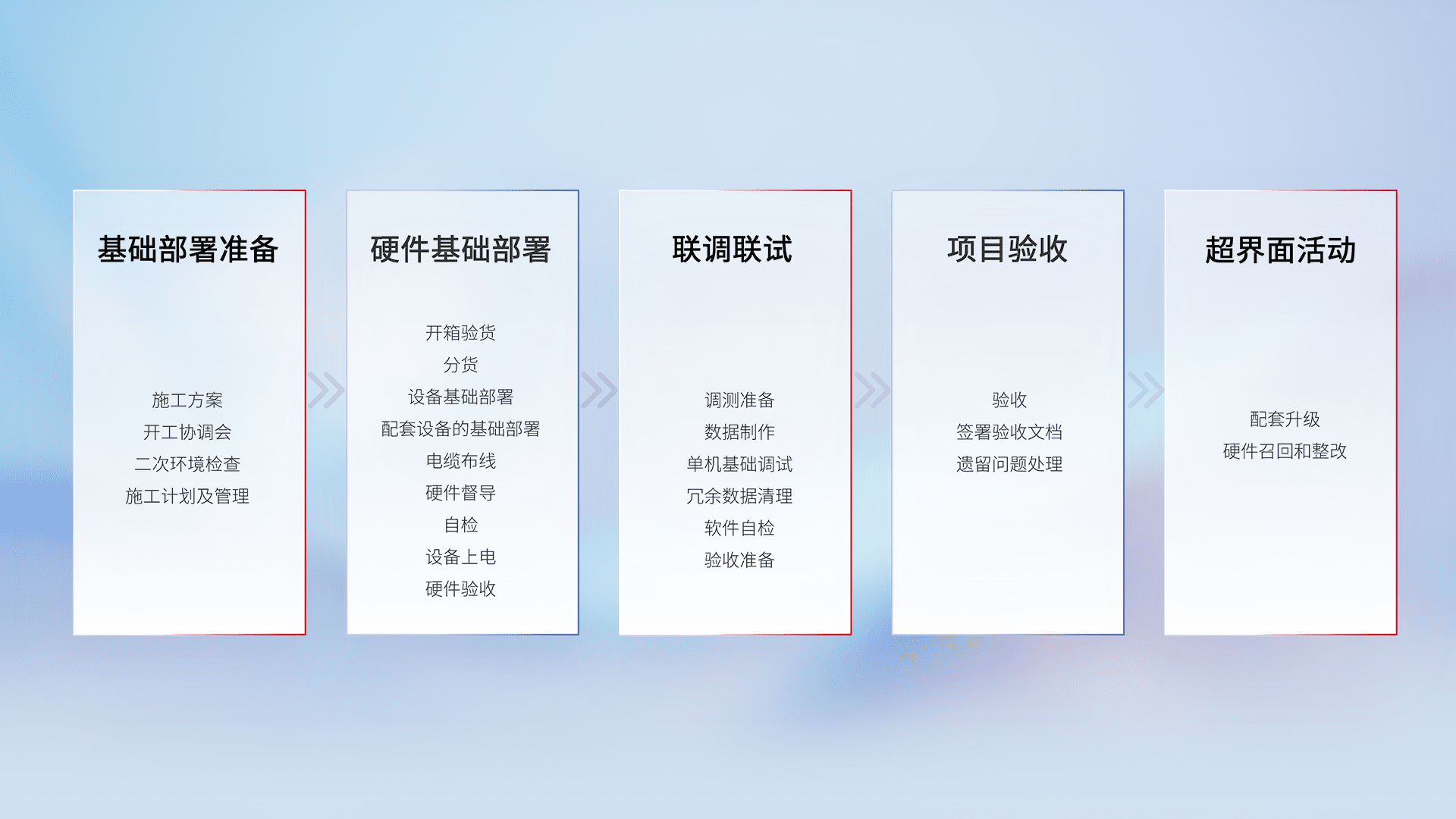 从基础部署准备、、、、硬件基础部署、、联调联试、、项目验收、、、、越界面活动的全过程可追溯,,保证施工质量和进度。。